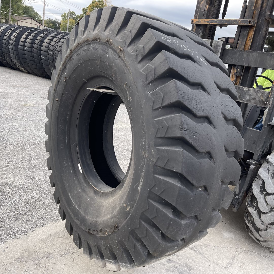 24.00X35 Goodyear brand bias OTR tractor tire. It is a HRL4B E-4 model with a 42-Ply load rating. This is a Retread-Used tire with a tread depth of 44/32nds. The condition report reads: Clean.