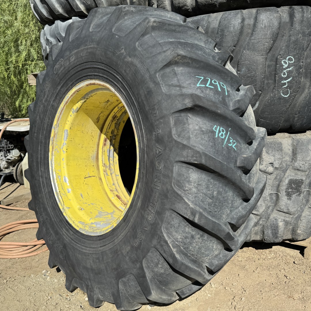 24.5X32 Samson brand bias OTR tractor tire. It is a Agri-Trac+ R-1K model with a 12-Ply load rating. This is a Used tire with a tread depth of 48/32nds. The condition report reads: Clean, Aged, On Rim, Water Filled.