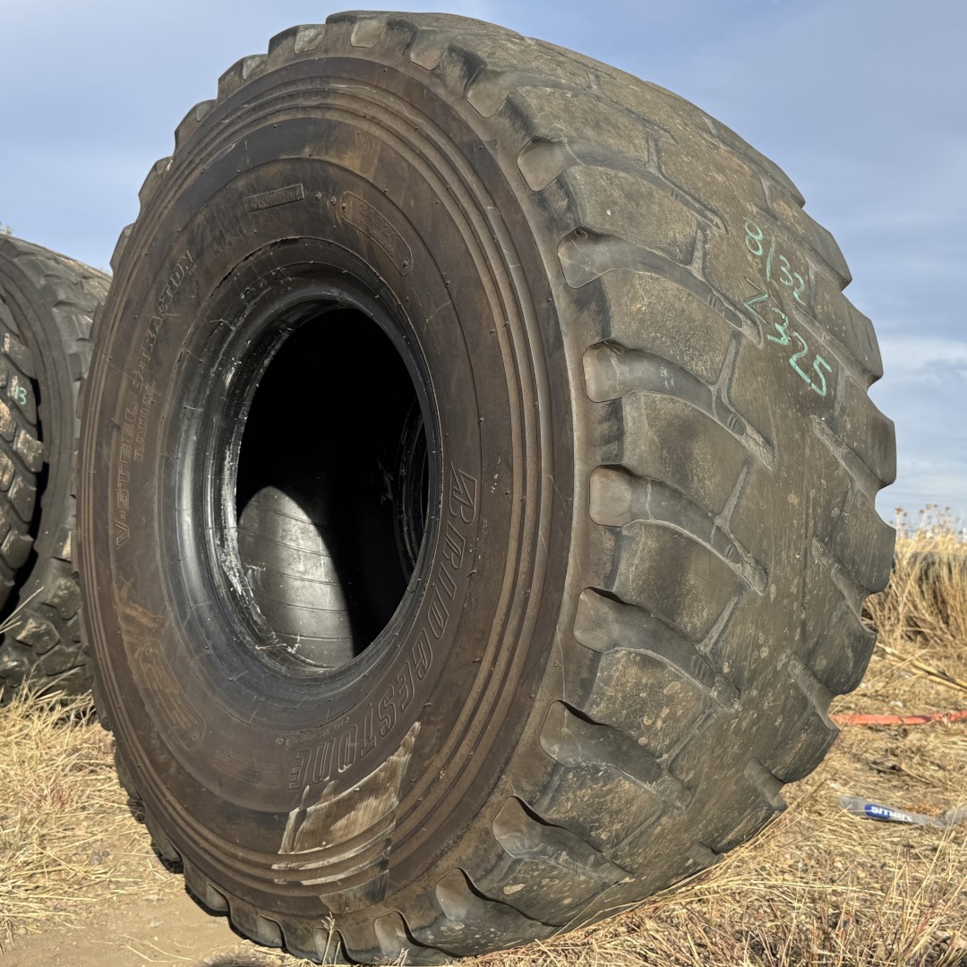 24R21 Bridgestone brand radial OTR tractor tire. It is a VGT E-2 model with a 1-Star load rating. This is a Used tire with a tread depth of 8/32nds. The condition report reads: Clean, 2-Balance Pads.