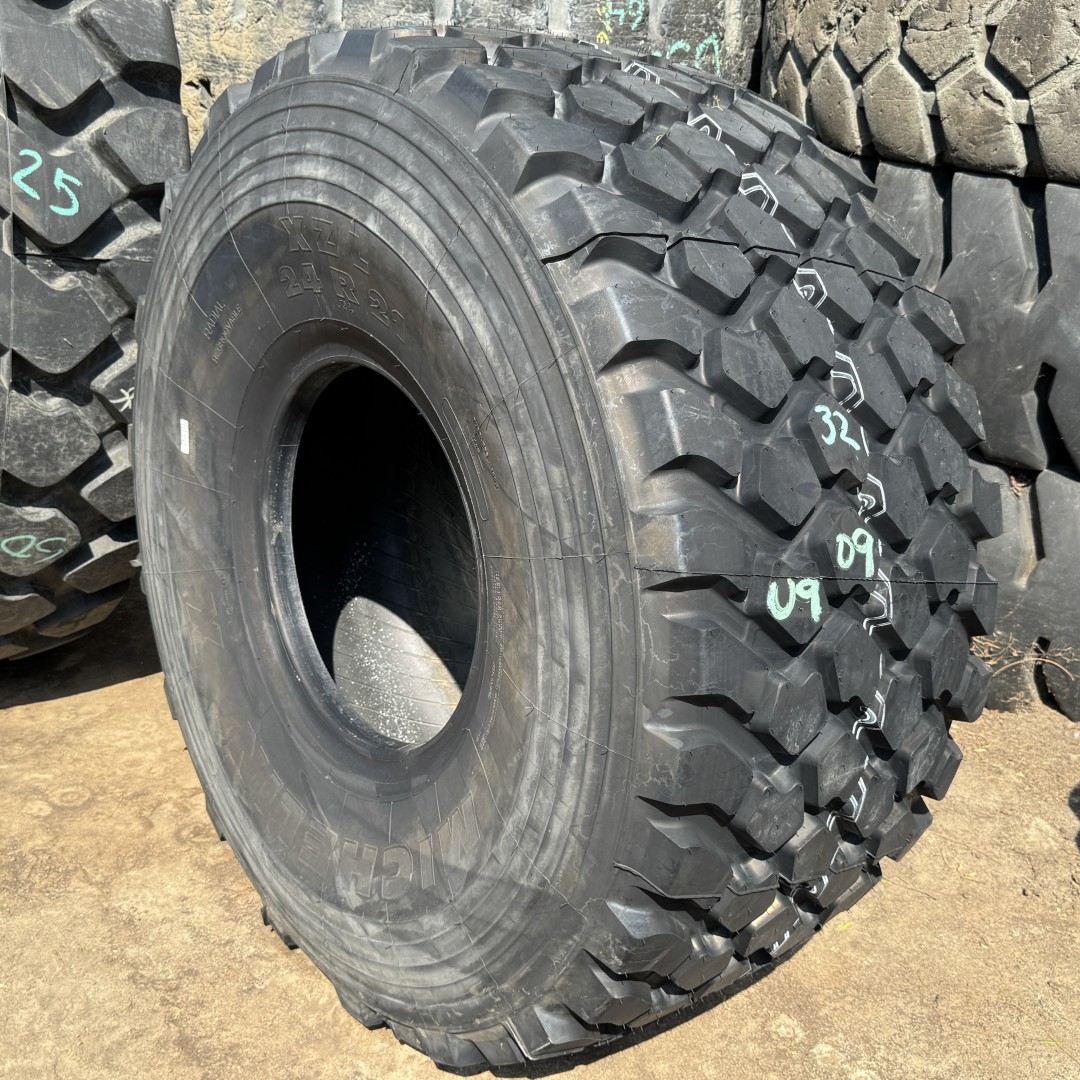 24R21 Michelin brand radial OTR tractor tire. It is a XZL Military M-3 Off-Road model with a 16-Ply load rating. This is a New tire with a tread depth of 32/32nds. The condition report reads: Unused, 2017.