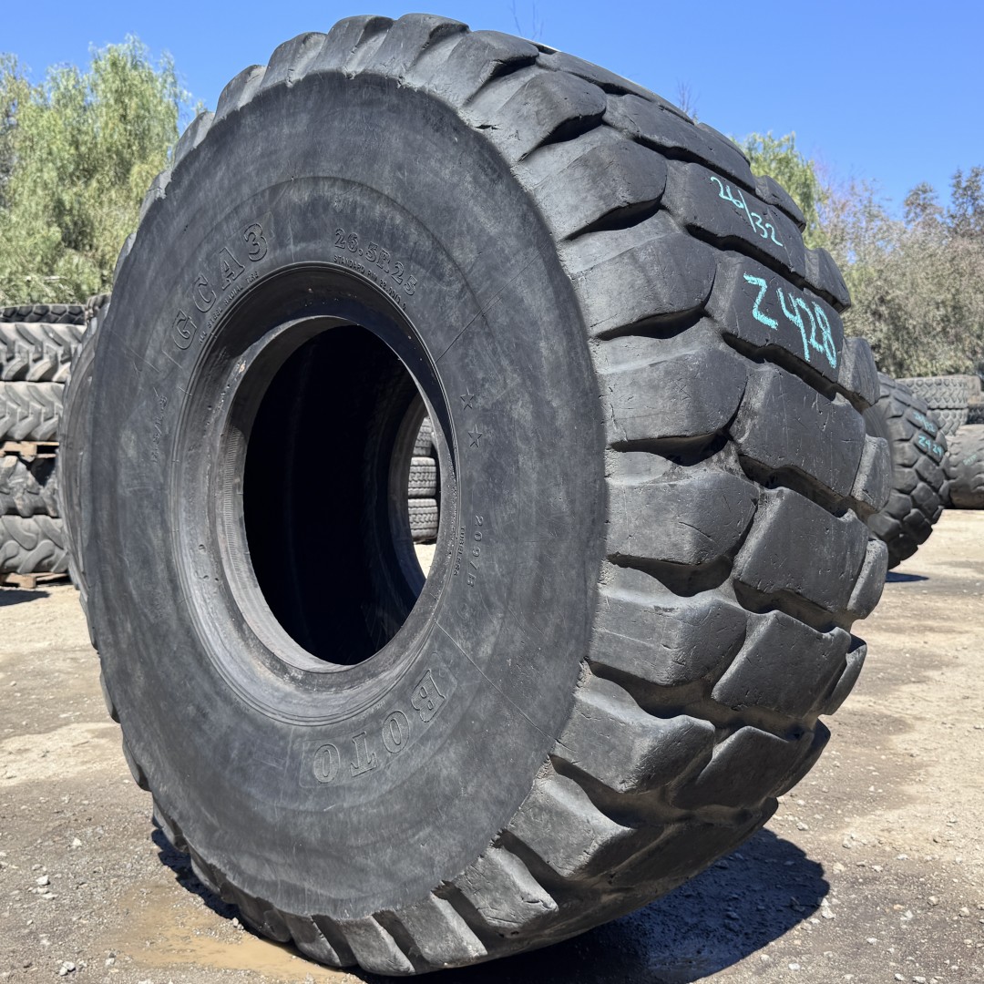 26.5R25 Boto brand radial OTR tractor tire. It is a GCA3 E3/L3 model with a 2-Star load rating. This is a Used tire with a tread depth of 26/32nds. The condition report reads: Clean.
