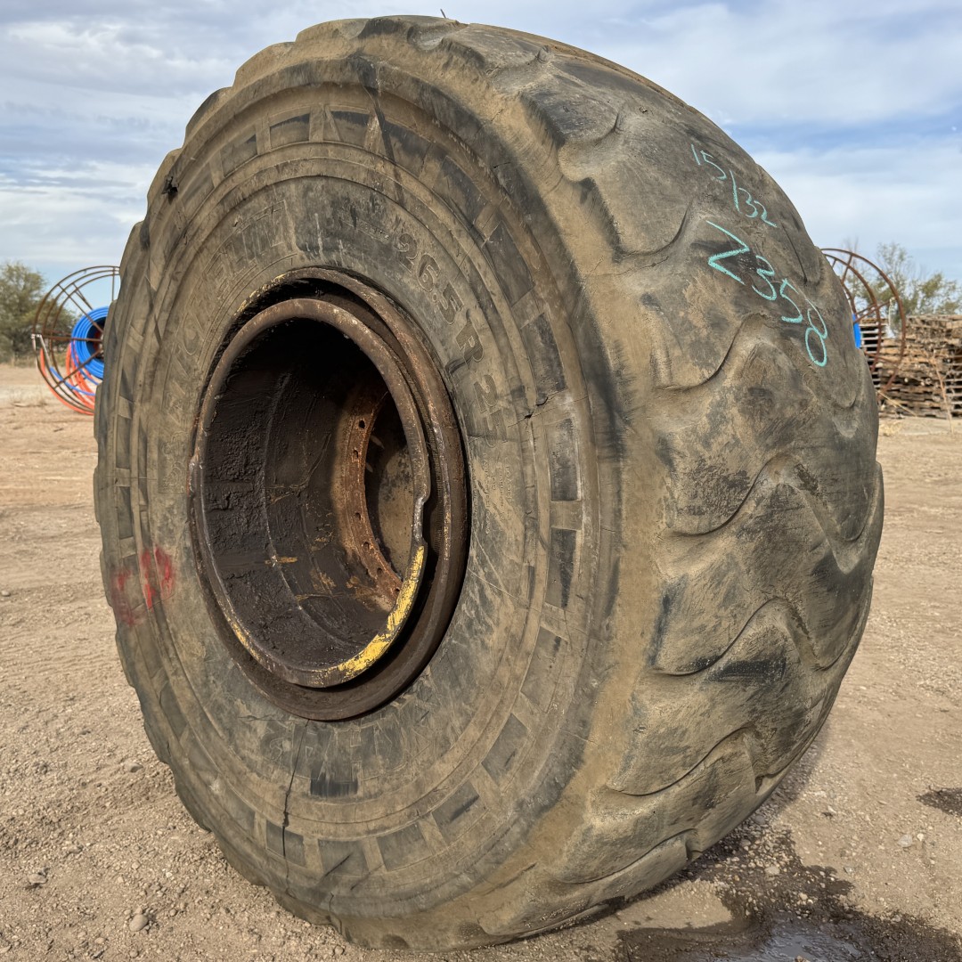 26.5R25 Michelin brand radial OTR tractor tire. It is a XHA2 E-3/L-3 model with a 2-Star load rating. This is a Used tire with a tread depth of 15/32nds. The condition report reads: Clean, Sidewall Cuts, On Rim.