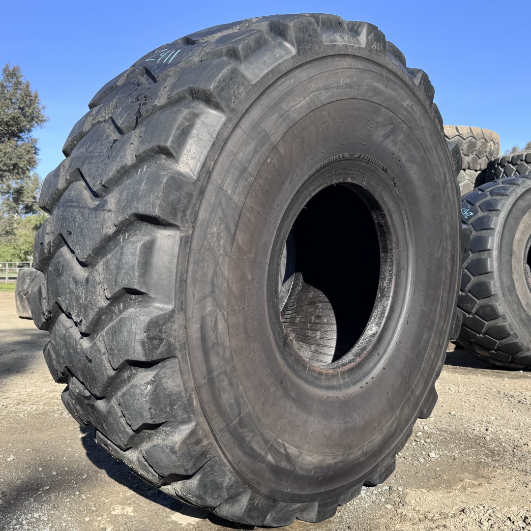 26.5R25 Mitas brand radial OTR tractor tire. It is a ERL30 E3/L3 model with a 2-Star load rating. This is a Used tire with a tread depth of 37/32nds. The condition report reads: Clean, Sidewall Cuts on One Side, Rough Tread.