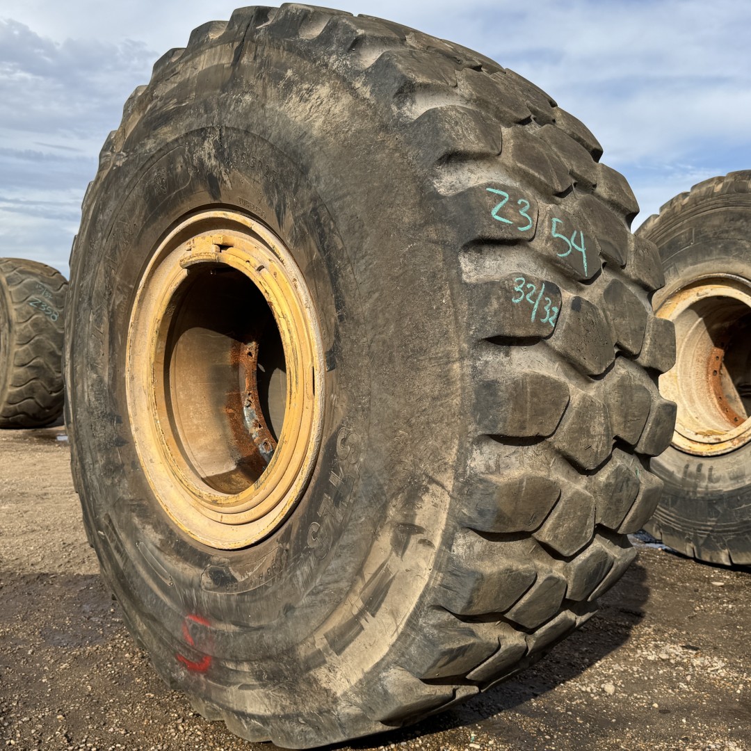 26.5R25 Titan brand radial OTR tractor tire. It is a STL3 E-3/L-3 model with a 2-Star load rating. This is a Used tire with a tread depth of 32/32nds. The condition report reads: Clean, Weathered Tread, On Rim.