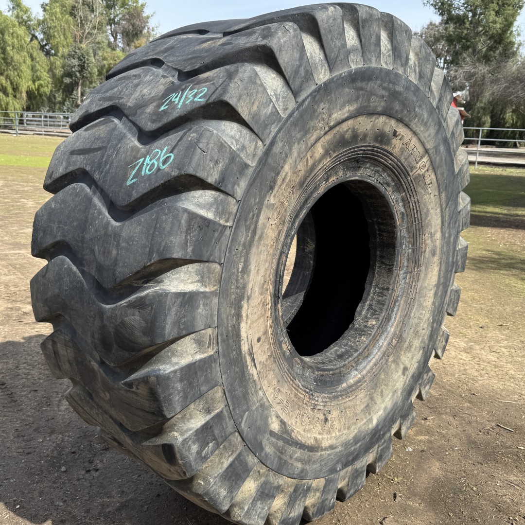 26.5X25 Armour brand bias OTR tractor tire. It is a E3 E-3 model with a 28-Ply load rating. This is a Used tire with a tread depth of 24/32nds. The condition report reads: Clean.