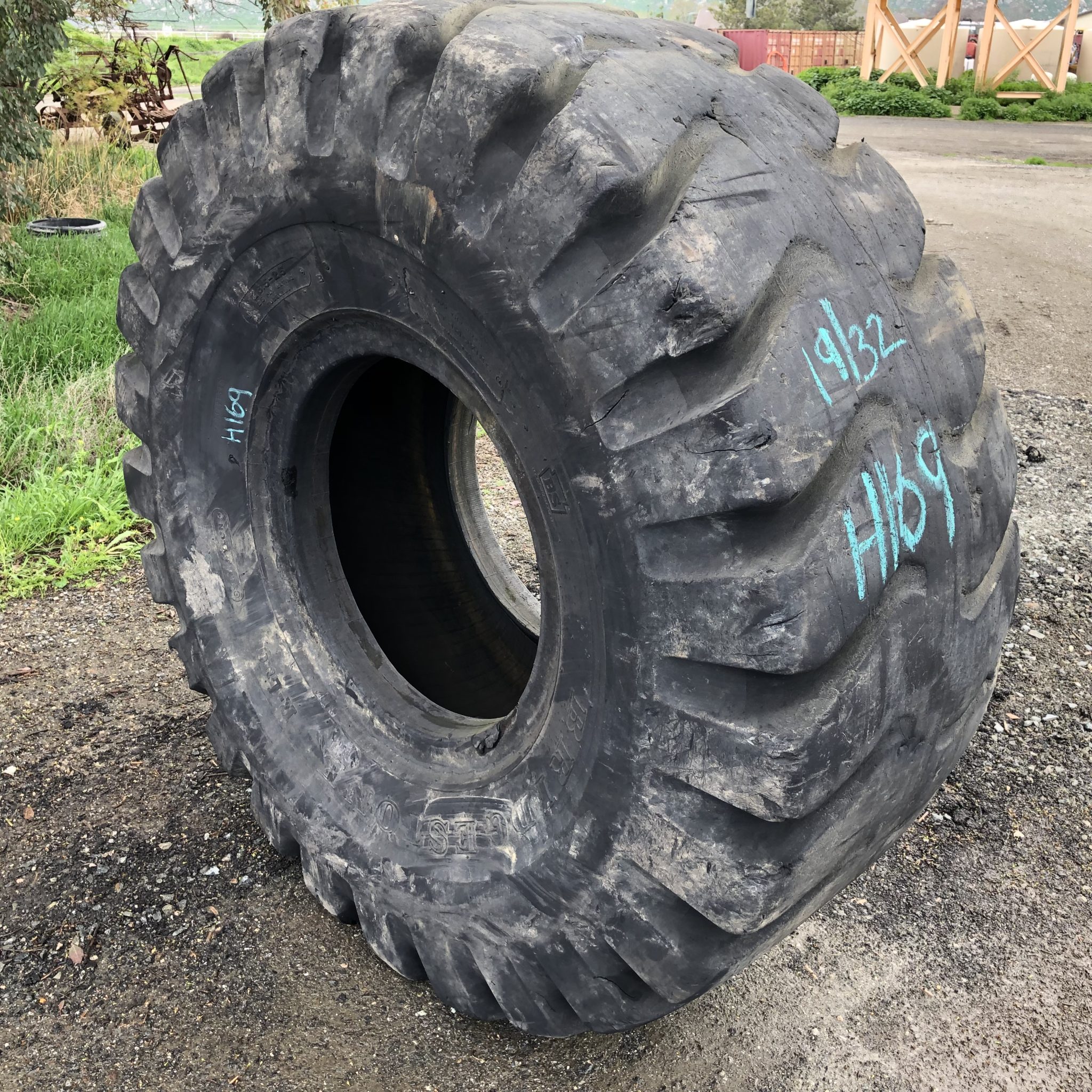 26.5X25 Bridgestone brand bias OTR tractor tire. It is a Rlug E4 model with a 26-Ply load rating. This is a Used tire with a tread depth of 19/32nds. The condition report reads: 1-Tread Patch, 2-Nail Plugs, Possible Repairs needed.