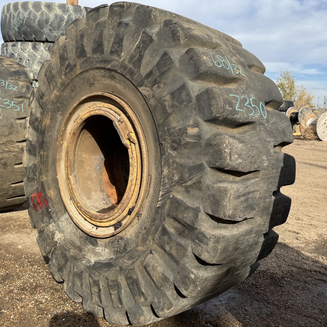 26.5X25 Yokohama brand bias OTR tractor tire. It is a Y545 L-4 model with a 24-Ply load rating. This is a Used tire with a tread depth of 68/32nds. The condition report reads: Clean, On Rim.