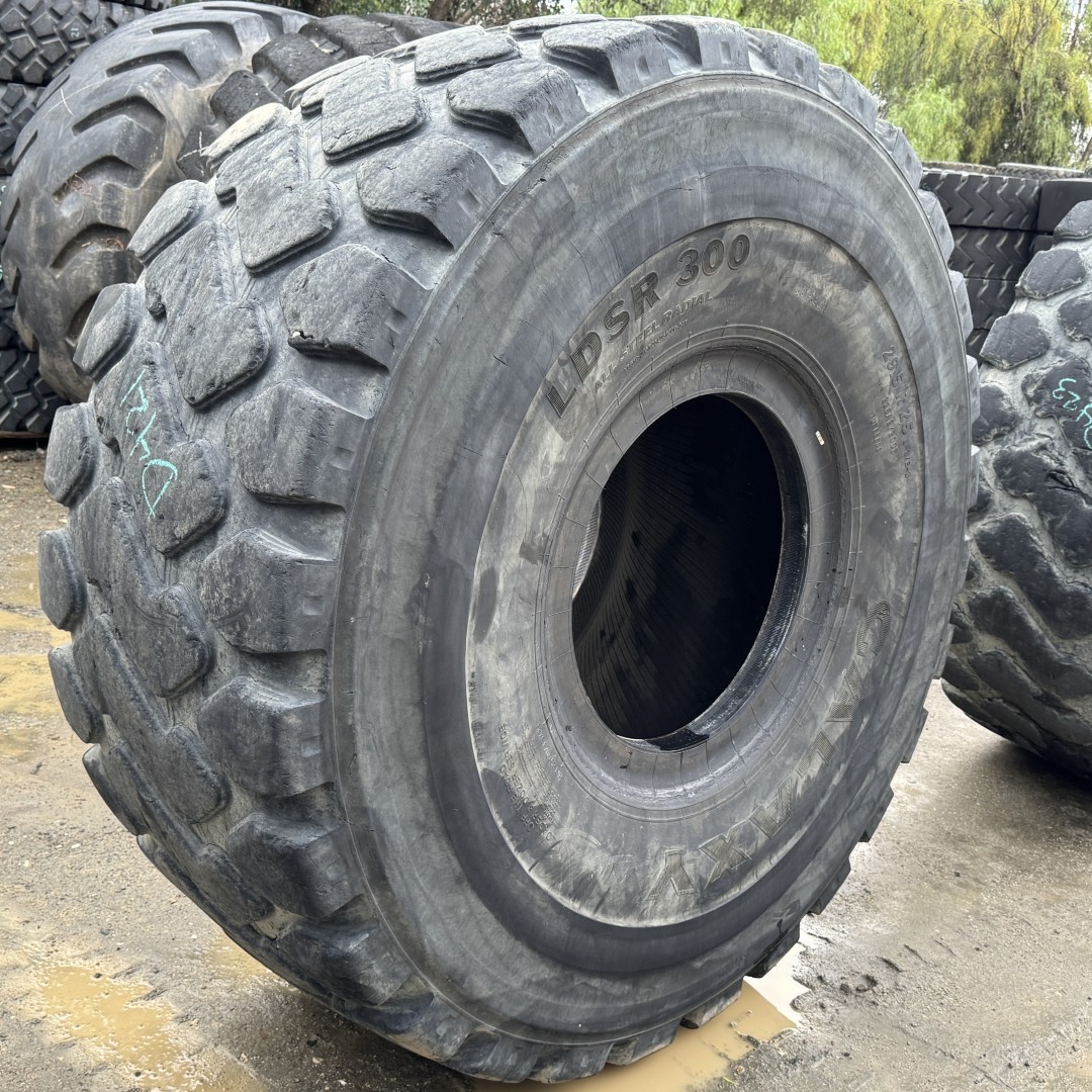 29.5R25 Galaxy brand radial OTR tractor tire. It is a LDSR 300 E3/L3 model with a 2-Star load rating. This is a Used tire with a tread depth of 27/32nds. The condition report reads: Clean, Minor Tread Cuts.