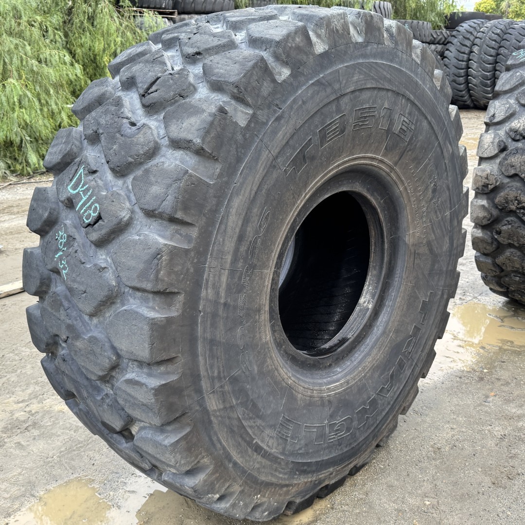 29.5R25 Triangle brand radial OTR tractor tire. It is a TB516 E3/L3 model with a 2-Star load rating. This is a Used tire with a tread depth of 38/32nds. The condition report reads: Clean, Minor Tread Cuts.