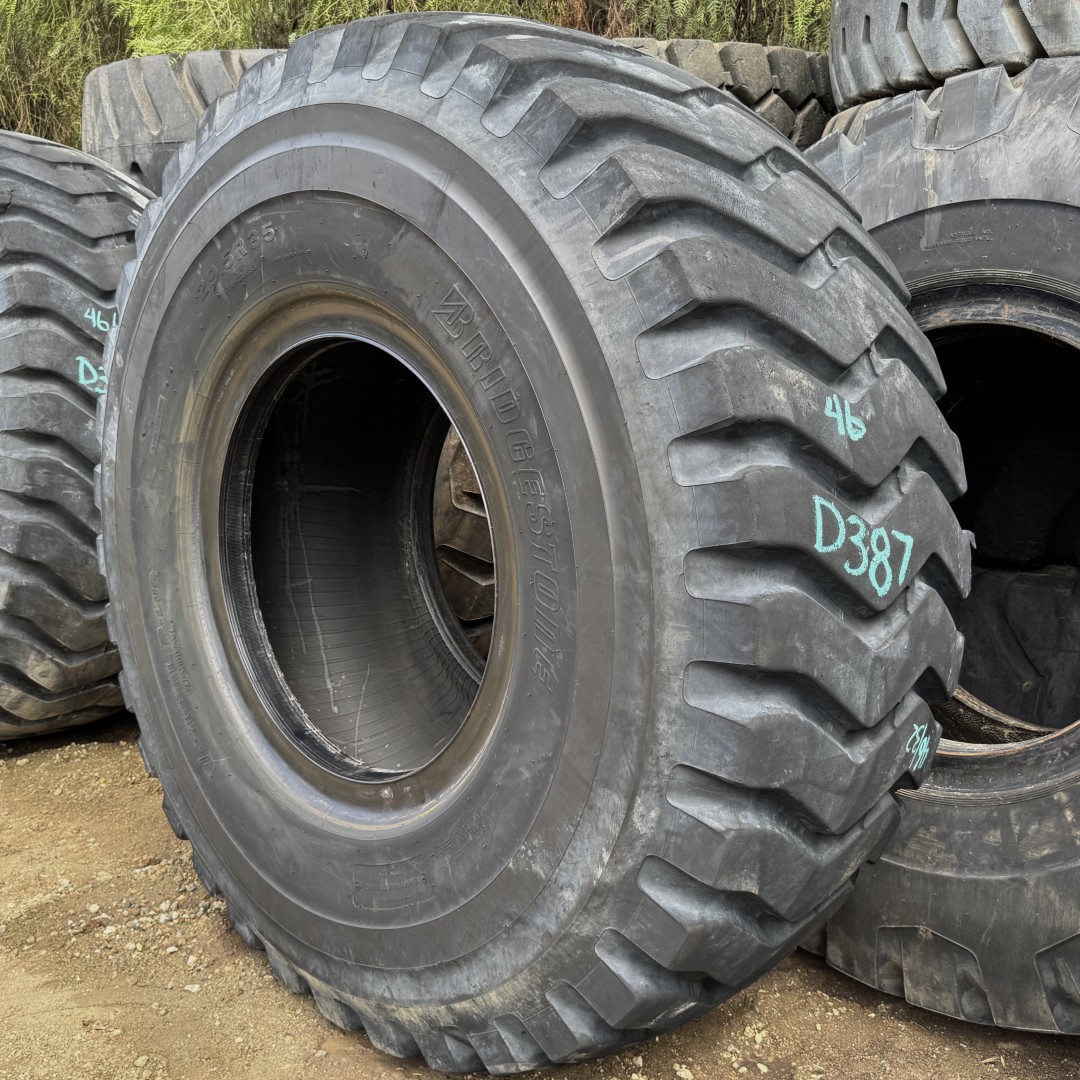 29.5R35 Bridgestone brand radial OTR tractor tire. It is a VRL E-3 model with a 2-Star load rating. This is a Used tire with a tread depth of 46/32nds. The condition report reads: Clean, Mildly Weathered Lugs.