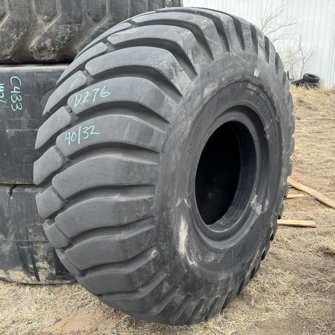 29.5X25 Titan brand bias OTR tractor tire. It is a NDLCM E-3/L-3 model with a 28-Ply load rating. This is a Used tire with a tread depth of 40/32nds. The condition report reads: Clean, Bead Wrap, Shoulder Spots on One Side.