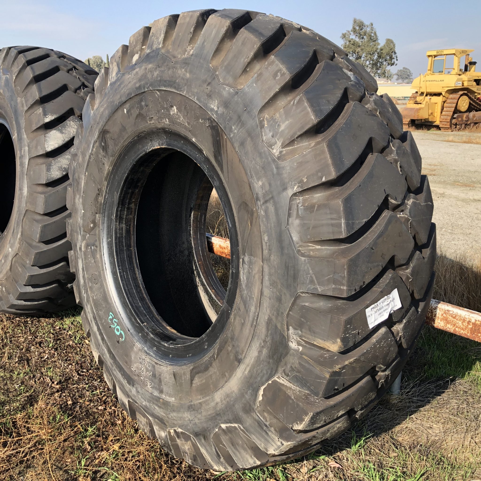 29.5X35 Firestone brand bias OTR tractor tire. It is a SRG Super Rock Grip E3/L3 model with a 34-Ply load rating. This is a New-Take-Off tire with a tread depth of 49/32nds. The condition report reads: Clean.