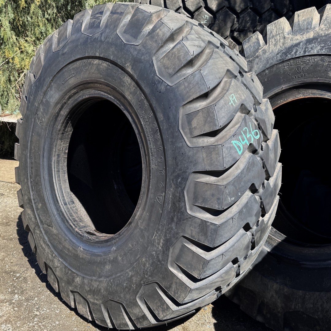 29.5X35 Firestone brand bias OTR tractor tire. It is a SRG Super Rock Grip E3/L3 model with a 34-Ply load rating. This is a New-Take-Off tire with a tread depth of 49/32nds. The condition report reads: Clean.