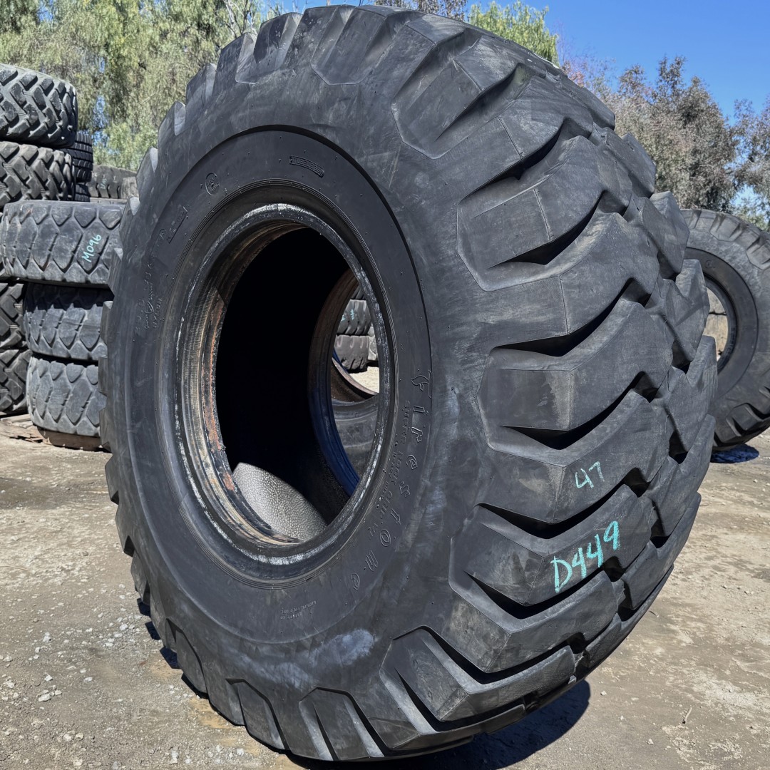29.5X35 Firestone brand bias OTR tractor tire. It is a SRG Super Rock Grip E3/L3 model with a 34-Ply load rating. This is a Used tire with a tread depth of 47/32nds. The condition report reads: Clean.