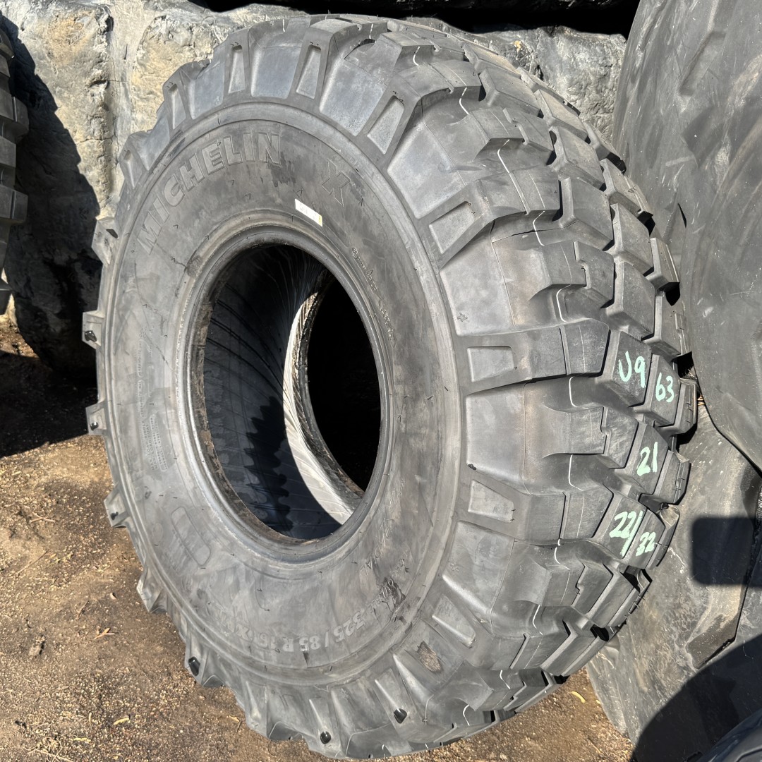 325/85R16 Michelin brand radial OTR tractor tire. It is a XML Military M-3 Off-Road model with a 137J load rating. This is a New-Take-Off tire with a tread depth of 22/32nds. The condition report reads: Clean, 2021.