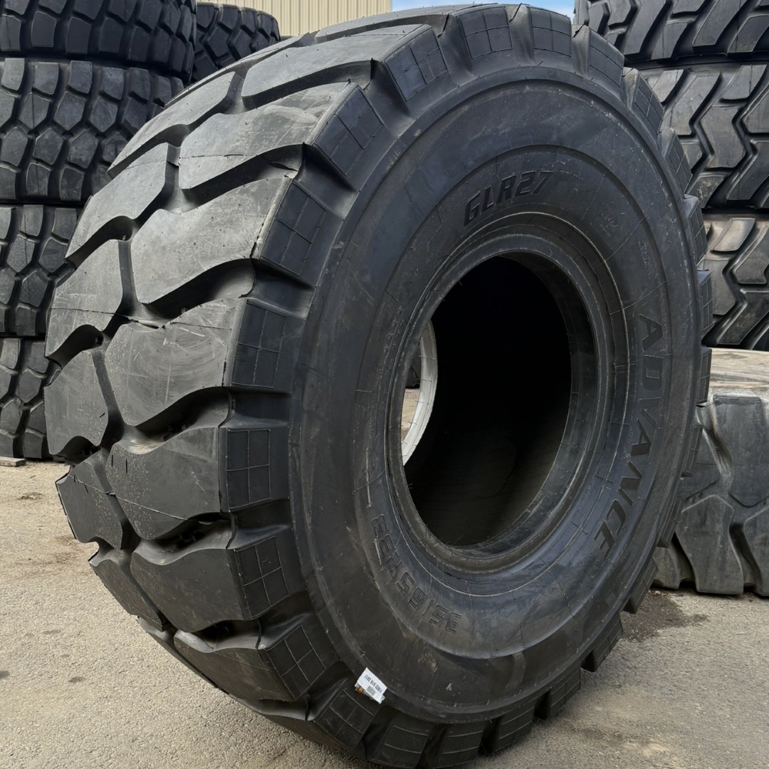 35/65R33 Advance brand radial OTR tractor tire. It is a GLR27 E4/L4 model with a 4-Star load rating. This is a New tire with a tread depth of 78/32nds. The condition report reads: Unused.