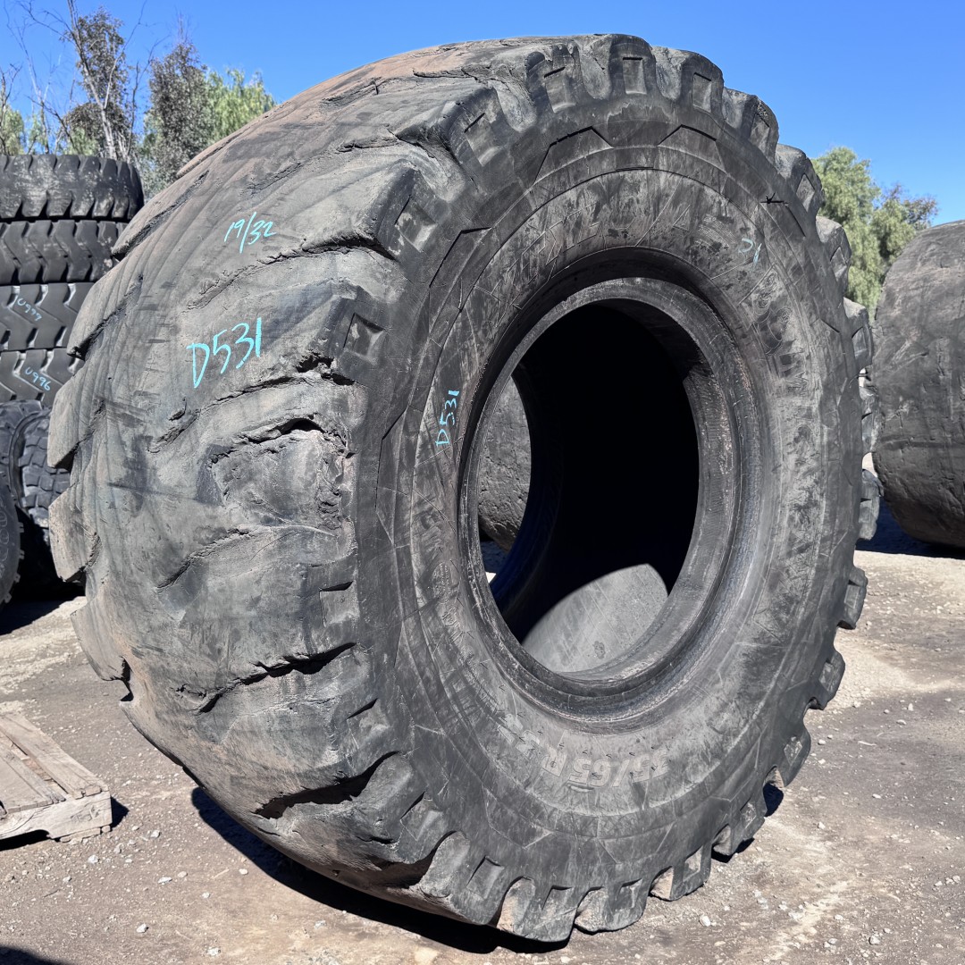 35/65R33 Michelin brand radial OTR tractor tire. It is a XTXL E4/L4 model with a 3-Star load rating. This is a Used tire with a tread depth of 19/32nds. The condition report reads: Clean, Rough Tread, Shoulder Damaged.