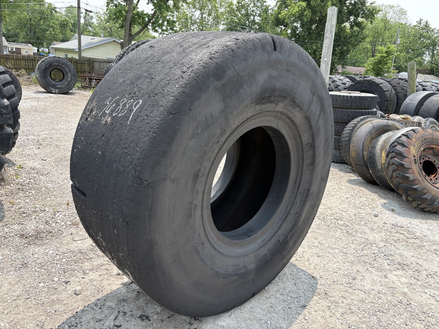 35/65X33 Firestone brand bias OTR tractor tire. It is a PTLD L5 Plain Tread L-5S model with a 42-Ply load rating. This is a Used tire with a tread depth of 98/32nds. The condition report reads: Clean.