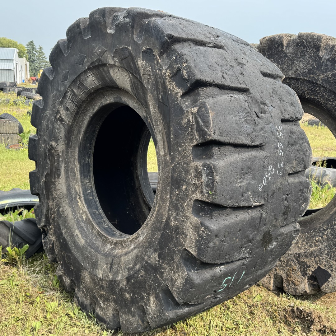 35/65X33 Goodyear brand bias OTR tractor tire. It is a NRLDL5A L-5 model with a 24-Ply load rating. This is a Used tire with a tread depth of /32nds. The condition report reads: Clean, Full Sidewall Spot on One Side.