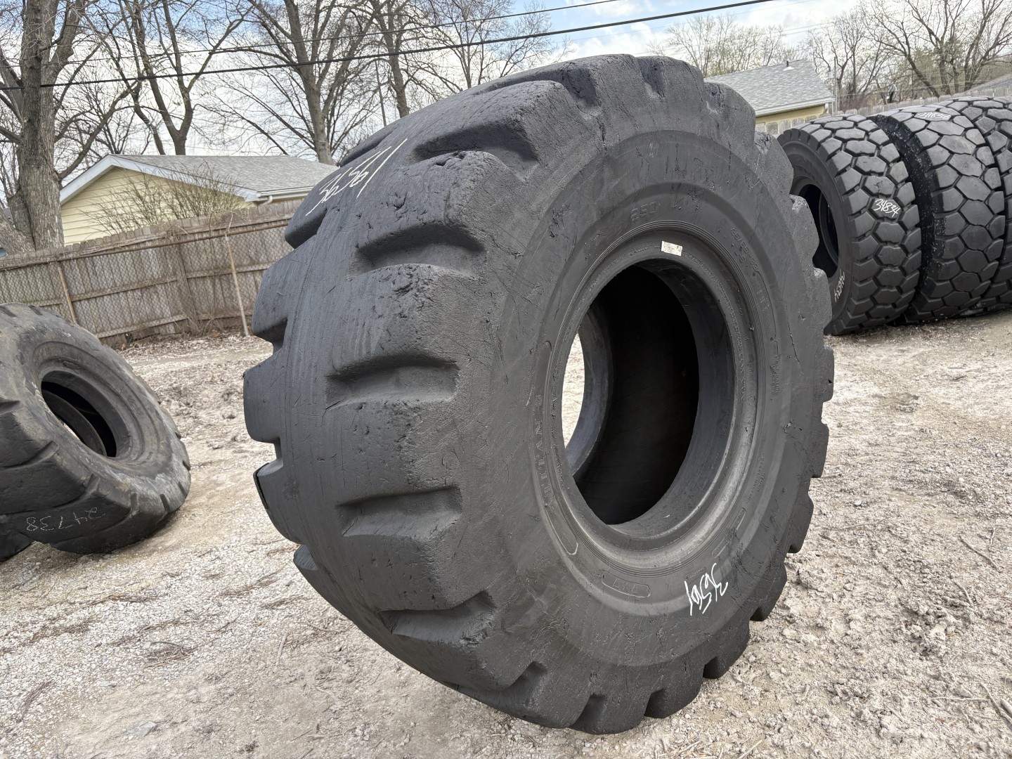 35/65X33 Titan brand bias OTR tractor tire. It is a LD250 L-5 model with a 42-Ply load rating. This is a Used tire with a tread depth of 60/32nds. The condition report reads: Clean, 2-Sidewall Spots, Liner Spot.