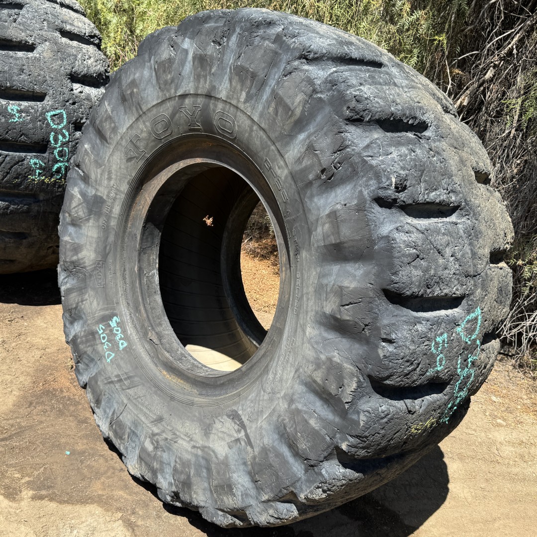 35/65X33 Toyo brand bias OTR tractor tire. It is a G65 L-5 model with a 24-Ply load rating. This is a Used tire with a tread depth of 59/32nds. The condition report reads: Clean, Cosmetic Rock Cuts on One Sidewall/Shoulder.