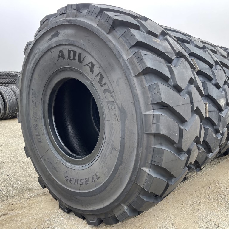 37.25R35 Advance brand radial OTR tractor tire. It is a GLR18 E-3 model with a 2-Star load rating. This is a New tire with a tread depth of 59/32nds. The condition report reads: Unused.