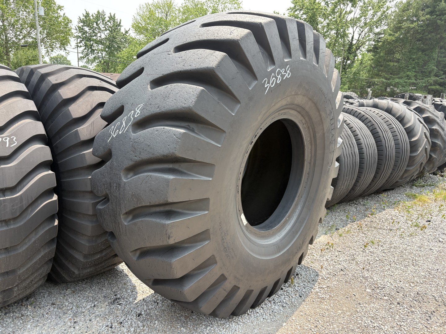 37.25X35 Titan brand bias OTR tractor tire. It is a CM150 CM 150 E-4 model with a 36-Ply load rating. This is a Used tire with a tread depth of 62/32nds. The condition report reads: Clean.