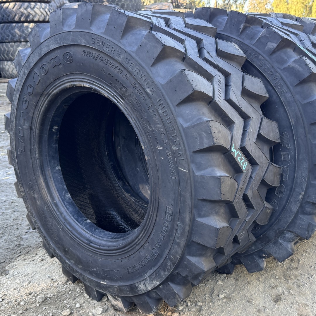 385/65D19.5 Firestone brand bias OTR tractor tire. It is a Duraforce ND NHS model with a 16-Ply load rating. This is a New tire with a tread depth of 25/32nds. The condition report reads: Unused, 15X19.5 15-19.5 385/65X19.5.