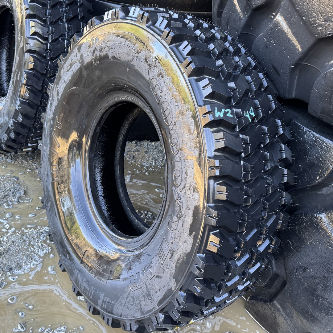 395/85R20 Goodyear brand radial OTR tractor tire. It is a MV/T Military M3 OffRoad model with a 166K load rating. This is a New tire with a tread depth of 26/32nds. The condition report reads: Unused, 2010.