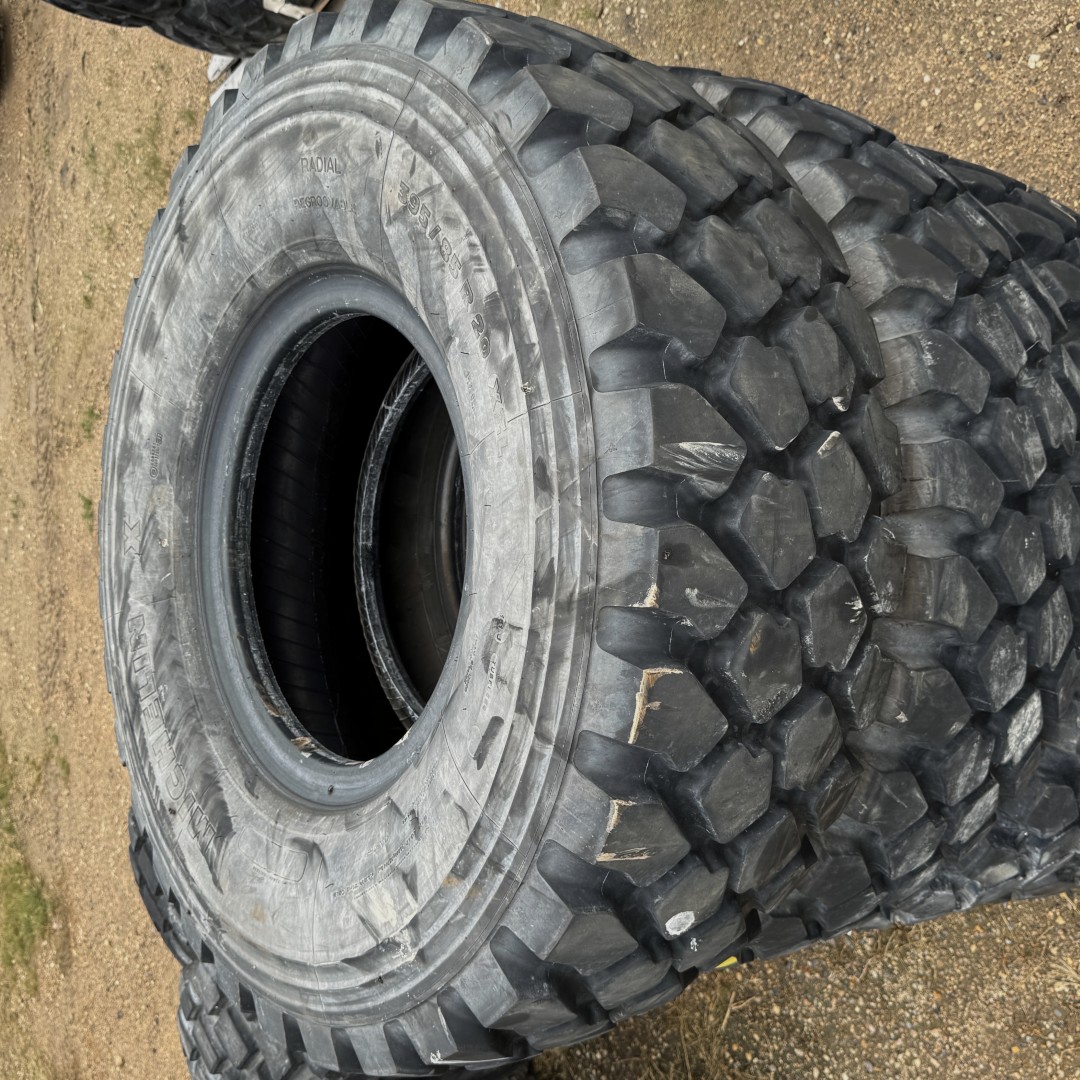395/85R20 Michelin brand radial OTR tractor tire. It is a XZL Military M-3 Off-Road model with a 168G load rating. This is a Used tire with a tread depth of 25/32nds. The condition report reads: Clean.
