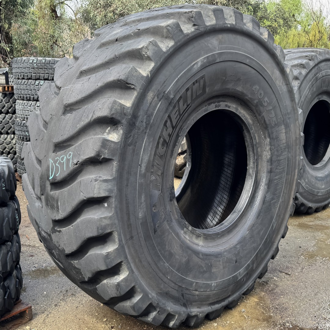 40.5/75R39 Michelin brand radial OTR tractor tire. It is a XMS E3 model with a 2-Star load rating. This is a Used tire with a tread depth of 38/32nds. The condition report reads: Clean, Sidewall & Bead Spots.