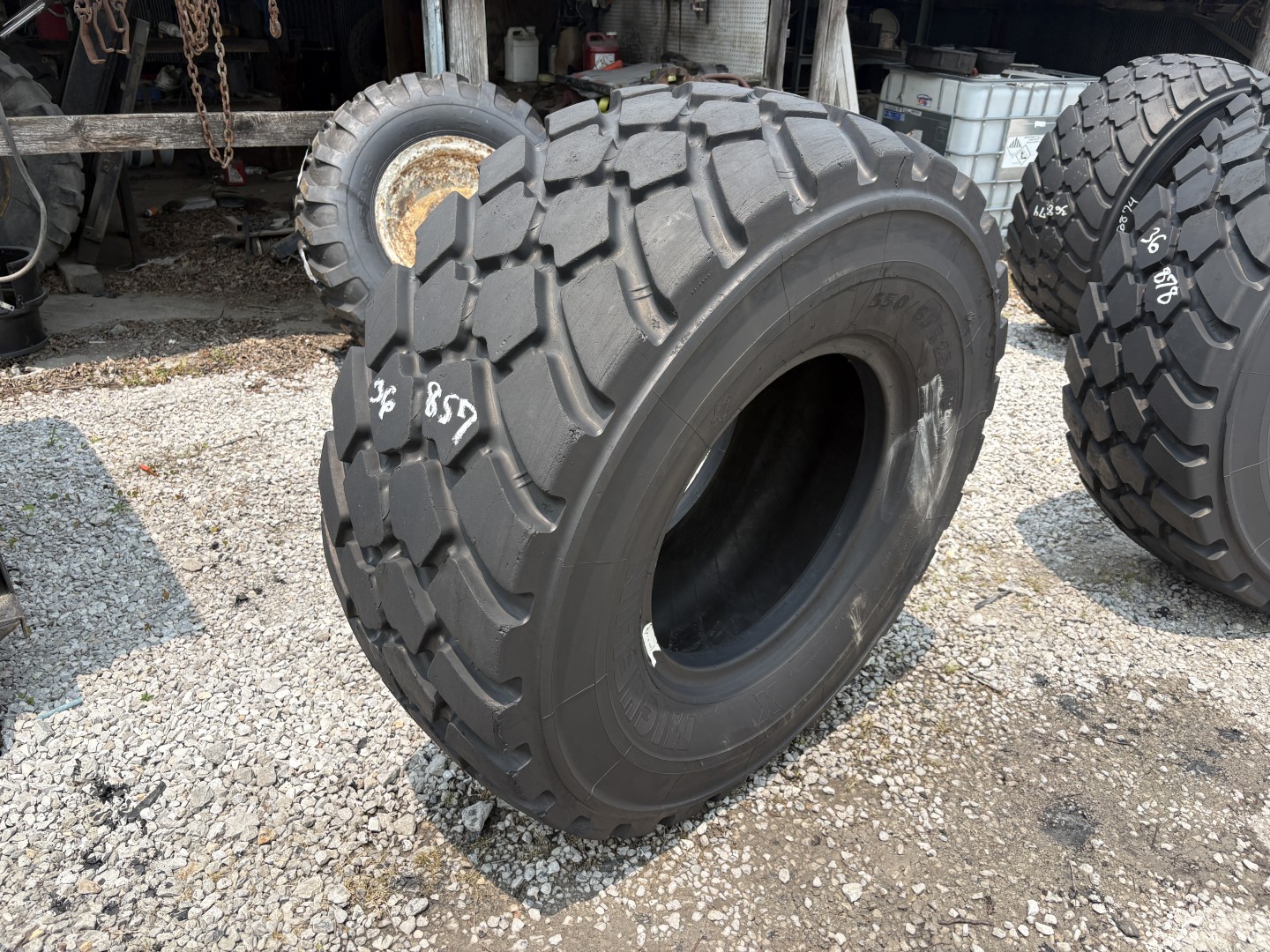 550/65R25 Michelin brand radial OTR tractor tire. It is a XLD L-3 model with a 1-Star load rating. This is a Used tire with a tread depth of 34/32nds. The condition report reads: 1-Sidewall Section.