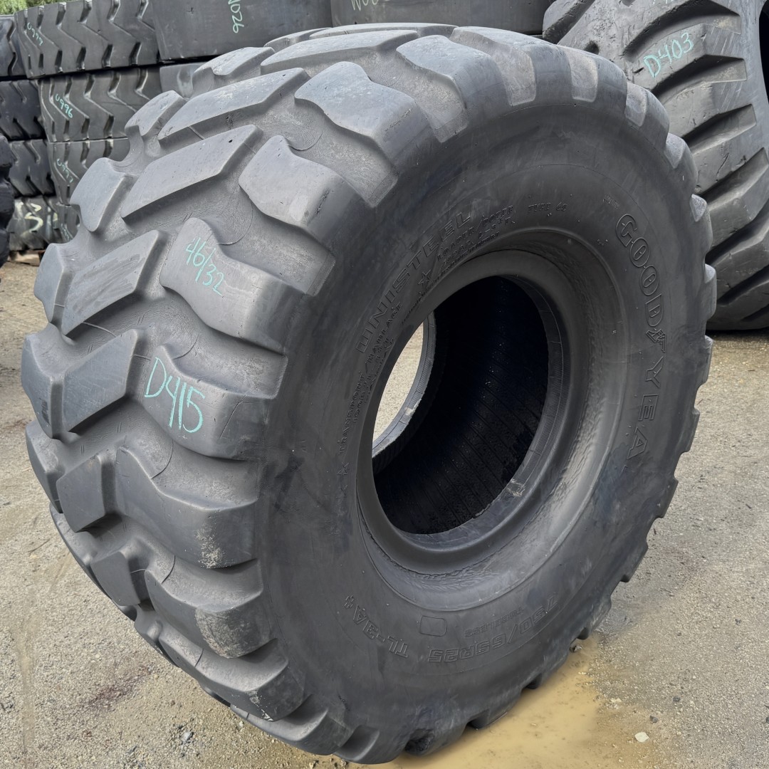 750/65R25 Goodyear brand radial OTR tractor tire. It is a TL3A+ TL-3A+ E-3/L-3 model with a 2-Star load rating. This is a Used tire with a tread depth of 46/32nds. The condition report reads: 1-Shoulder Section.