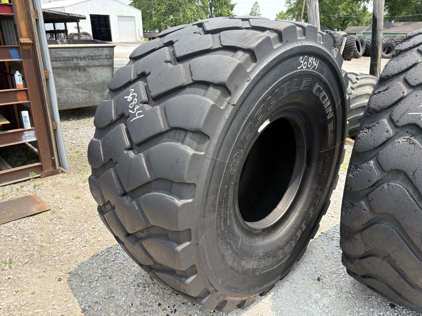 875/65R29 Double Coin brand radial OTR tractor tire. It is a REM2 E-3/L-3 model with a 2-Star load rating. This is a Used tire with a tread depth of 28/32nds. The condition report reads: Clean, Cuts on One Sidewall.
