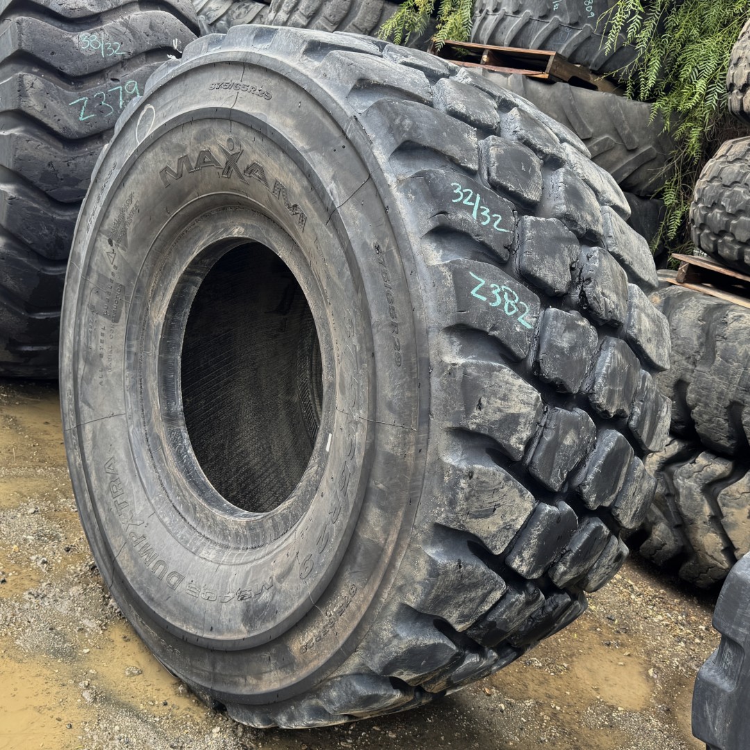 875/65R29 Maxam brand radial OTR tractor tire. It is a MS405 DumpXTRA E4/L4 model with a 2-Star load rating. This is a Used tire with a tread depth of 32/32nds. The condition report reads: Clean, Mildly Weathered Tread.